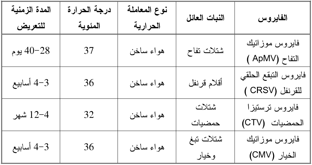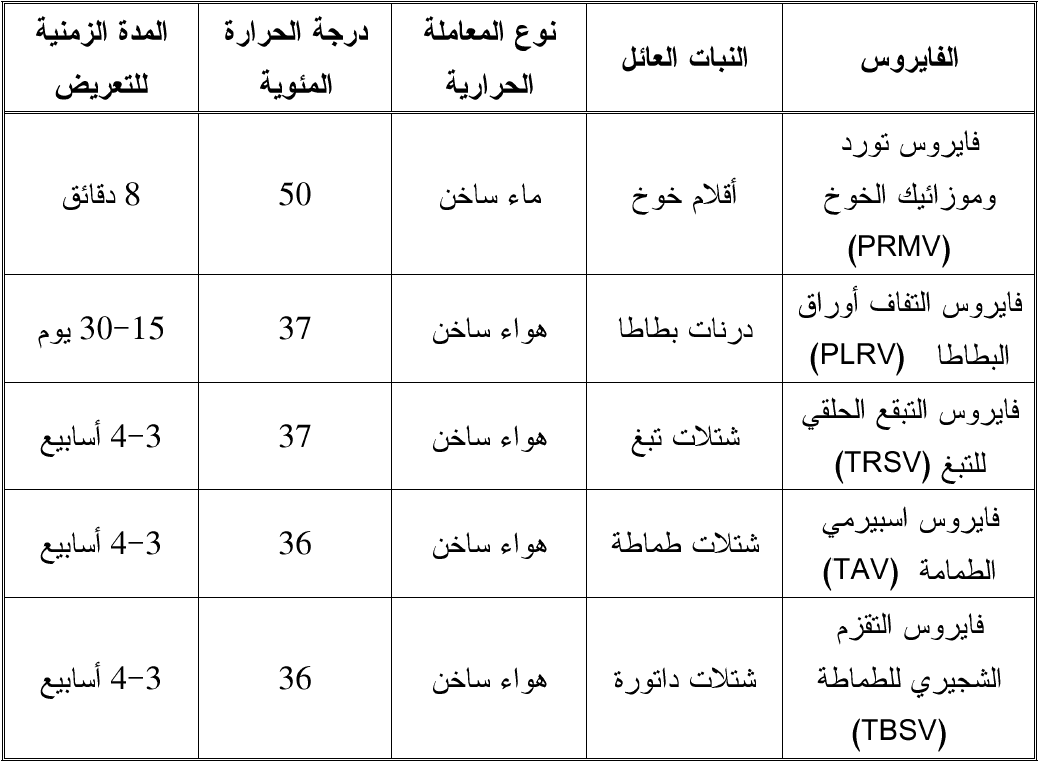 جدول يوضح عدد من المعاملات الحرارية المستعملة لإزالة الفايروسات من النباتات المصابة