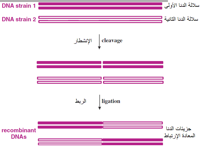 شكل يوضح إعادة الارتباط recombination بين جزيئتين من الدنا لسلالتين فايروسيتين