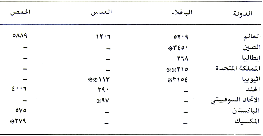 جدول (1) يبين المساحات الكلية المزروعة بالمحاصيل البقولية المهمة بألاف الهكترات للعالم والدول المشهورة بإنتاجه السنة 1974