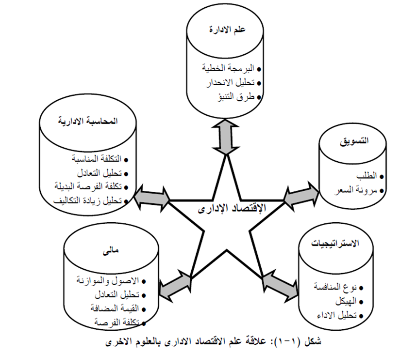 ١) علاقة الاقتصاد الادارى بالعلوم الاخرى - يبين شكل ( ١ ) سنوضح في هذا الكتاب أساسيات الاقتصاد الإداري من خلال العلاقة بين الاقتصاد والعلوم الاخرى مع التأكيد على عصب الاقتصاد الأداري وهى النظرية الاقتصادية الجزئية، هذه النظرية تمد متخذ القرار بمعلومات عن كيفية تخصيص الموارد النادرة للمؤسسة من أجل تعظيم الفائدة وتحقيق الاهداف.