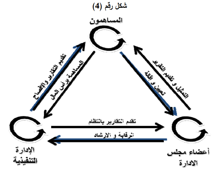2- ( الجمعية العمومية للمساهمين ) : هم حملة الأسهم وأصحاب الحق في المراقبة وٕاتخاذ القرارات، ومع هذا فإنه لاعتبارات التكلفة الناتجة عن انتشار الملكية وتفتيتها بين عدد كبير من المساهمين وعن عدم تخصص هؤلاء المساهمين في الإدارة فإن حملة الأسهم يفوضون سلطة إتخاذ القرارات لمجلس الإدارة. في المقابل يظل حملة الأسهم
