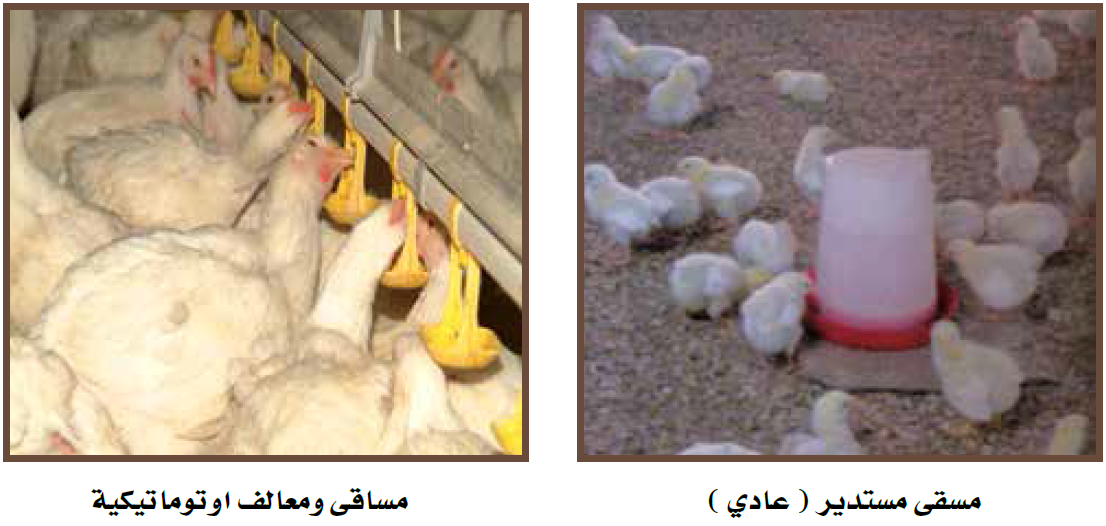 3- أما في فترة التربية فتستخدم المساقى الأوتوماتيكية أو الكبيرة لبقية الفترة حتى البيع وإذا استخدمت المساقى المستديرة المعلقة يخصص لكل مسقى عدد 80-100 طائر وإذا استخدمت المساقى الطويلة الأوتوماتيكية الأرضية يخصص 2 سم من طول المسقى من ناحية واحدة أو 1 سم من الناحيتين.