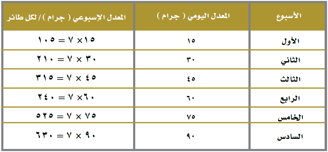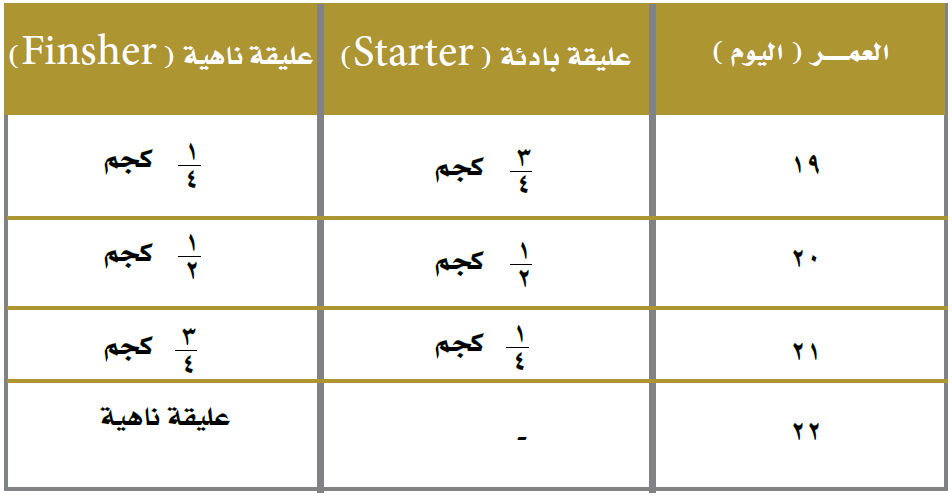 ويراعى تقديم الفيتامين في ماء الشرب خلال فترة تدرج التغذية لتلافي المشاكل المرضية التي قد تنتج عن تغير العليقة.