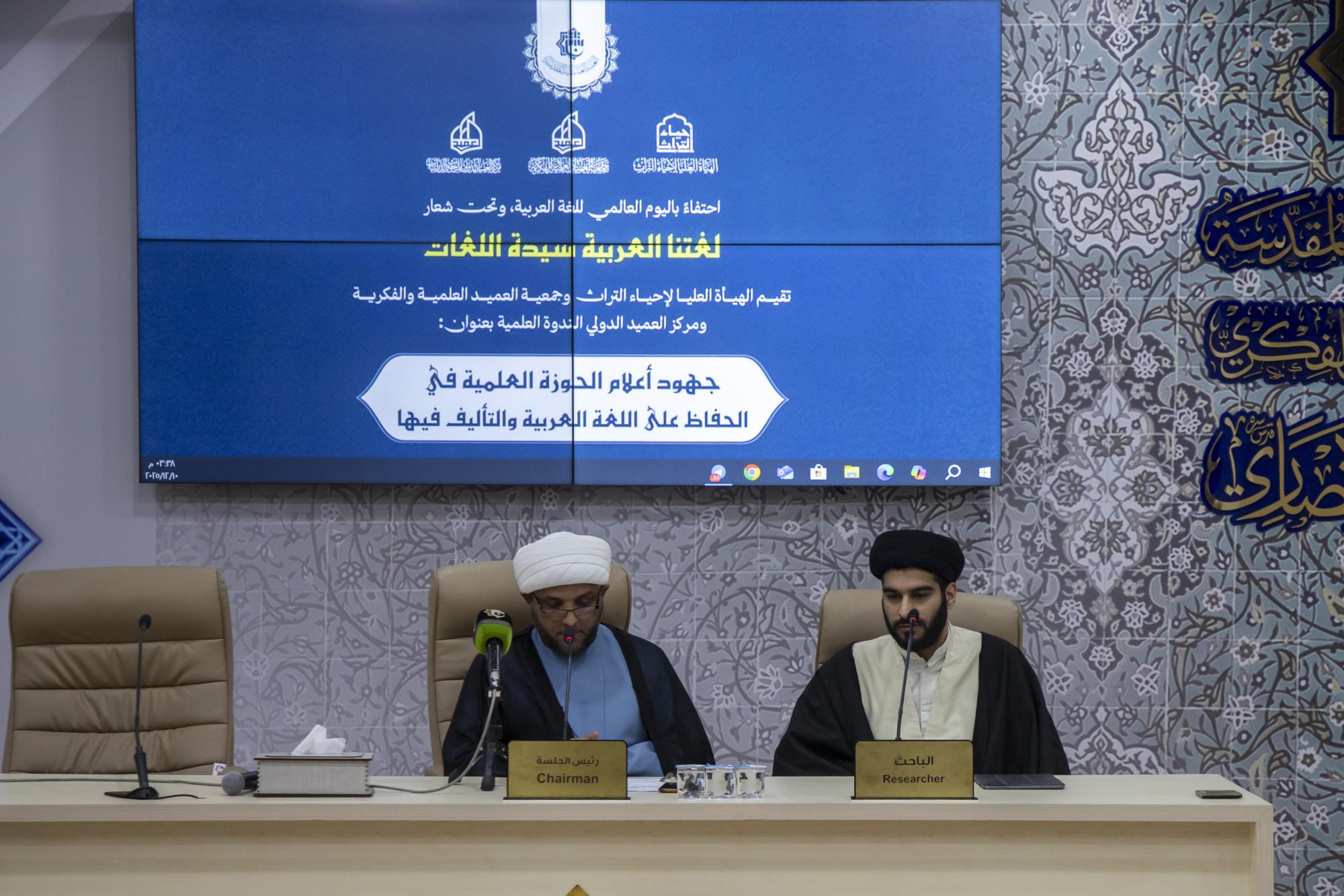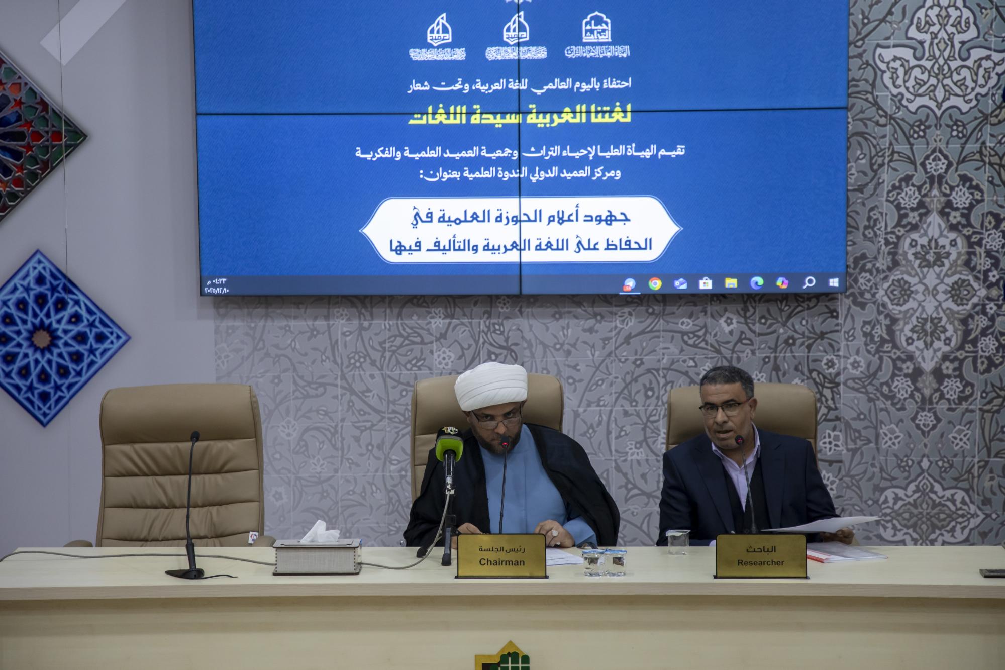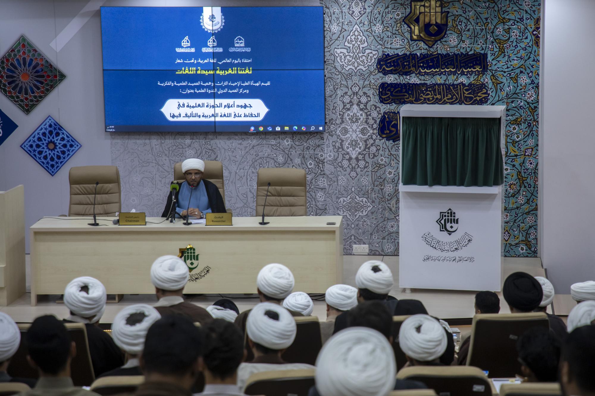 أقامت الهيأة العليا لإحياء التراث في العتبة العباسية المقدسة، ندوة علمية بمناسبة اليوم العالمي للغة العربية في محافظة النجف الأشرف. وأقيمت الندوة تحت شعار "لغتنا العربية سيدة اللغات" وبعنوان "جهود أعلام الحوزة العلمية في الحفاظ على اللغة العربية والتأليف فيها" في مجمّع الإمام المرتضى (عليه السلام) بمحافظة النجف، بالتعاون مع مركز العميد الدولي للبحوث والدراسات التابع لقسم الشؤون الفكرية والثقافية في العتبة المقدسة، وجمعية العميد العلمية والفكرية. وشهدت الندوة حضور المتولي الشرعي للعتبة المقدسة سماحة العلّامة السيد أحمد الصافي، وعدد من المسؤولين فيها، وشخصيات أكاديمية ودينية وطلبة الحوزة العلمية. وتضمنت الندوة كلمة للهيأة العليا لإحياء التراث ألقاها الشيخ محمد حسين بحسون ذكر فيها أنّ "علماءنا الأوائل تنبهوا إلى ضرورة الاهتمام باللغة العربية، ورعاية طرائفها وكشف لطائفها، وذلك اعتقادًا بشرف هذه اللغة، ورفيع كعبها الذي أعلى الله (عزّ وجل) بنيانها حين جعلها كلامه الذي كلّم به الخلق". وقال مدير المعهد العالي لإحياء التراث التابع للهيأة، الدكتور السيد عبد الحكيم الصافي: إنّ "الندوة شهدت عقد جلسة بحثية ترأسها الشيخ أركان التميمي، نوقشت فيها ثلاثة بحوث: الأوّل بعنوان (التحقيق النحوي عند الأصوليين: العلّامة السيد علي الموسوي البهبهاني نموذجًا)، للباحث السيد أحمد زيد الموسوي من الكويت، وجاء البحث الثاني بعنوان (تعريف علم البيان ووظيفته عند ركن الدين الجرجاني في كتابه الإشارات والتنبيهات في علم البلاغة) للباحث السيد محمد حسين الموسوي من إيران".