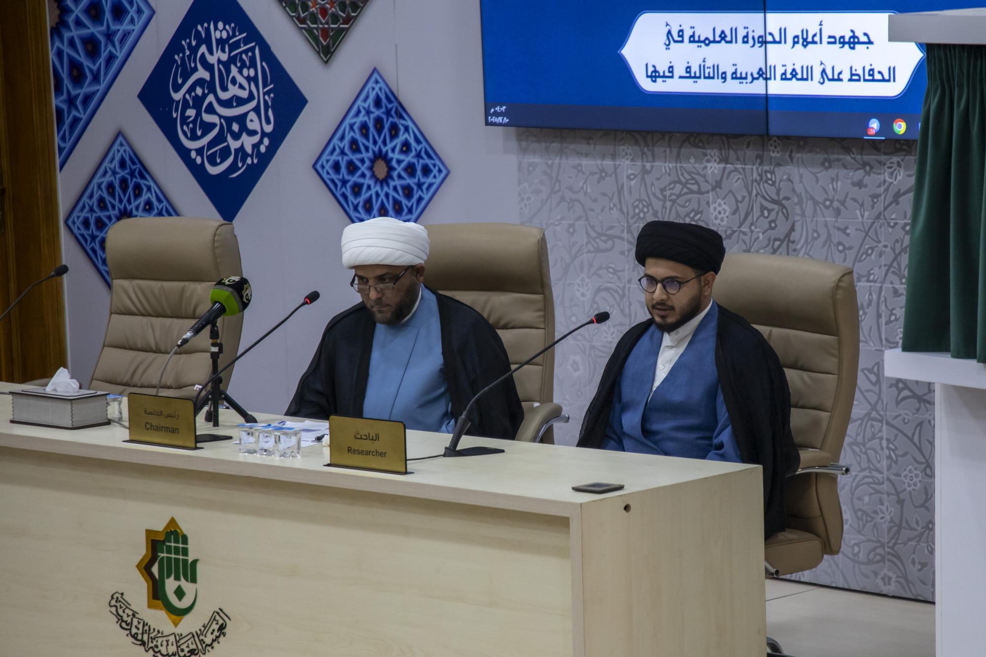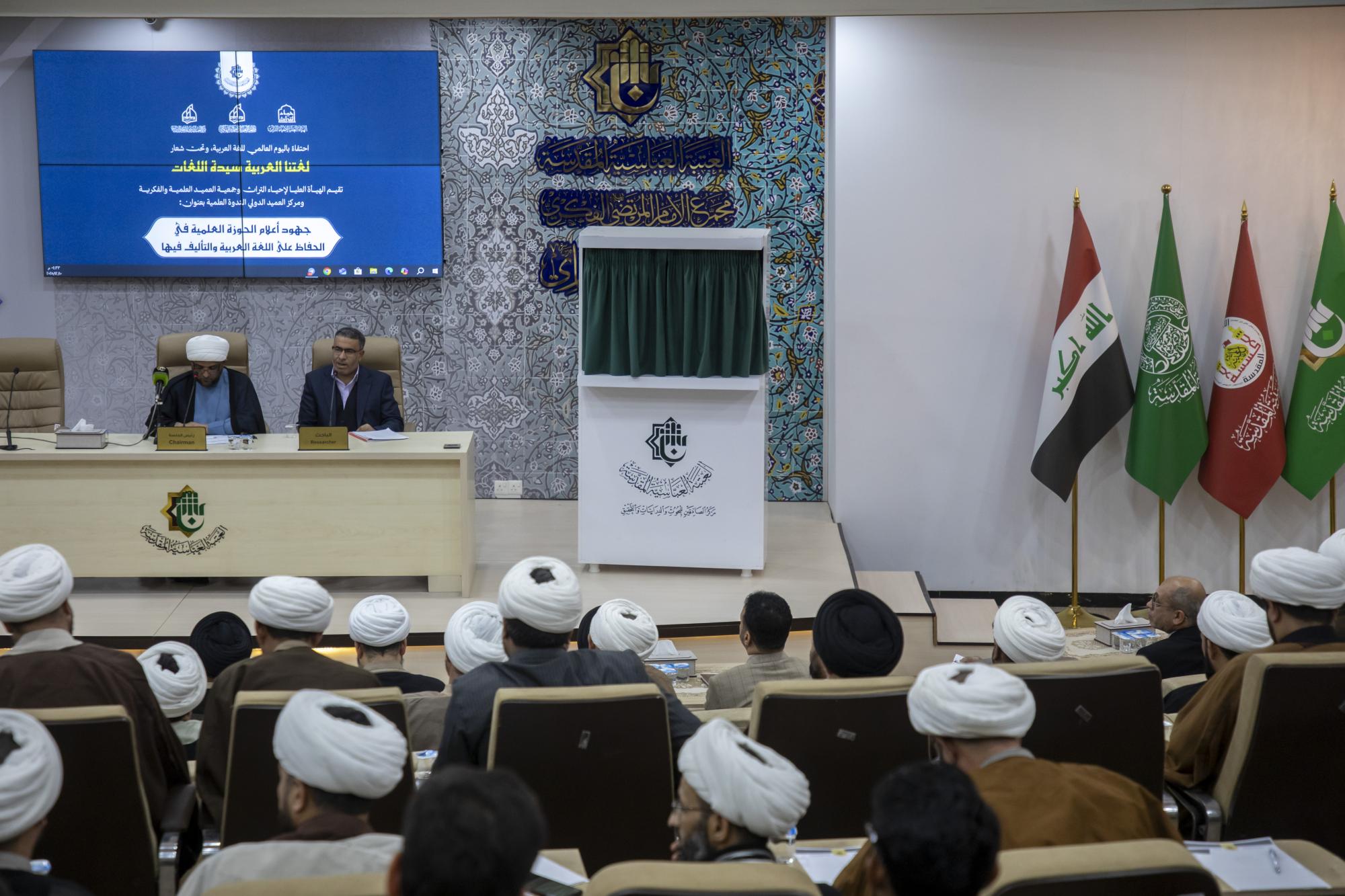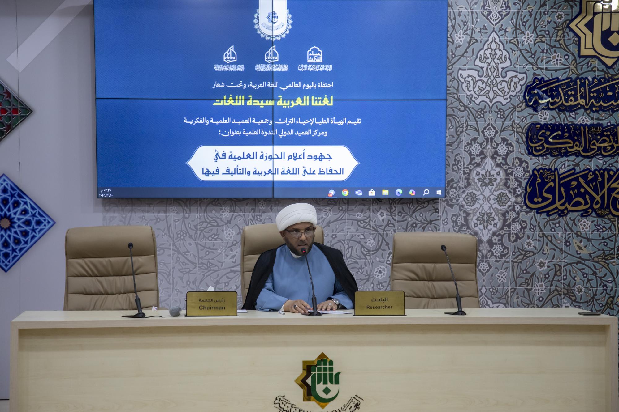 أقامت الهيأة العليا لإحياء التراث في العتبة العباسية المقدسة، ندوة علمية بمناسبة اليوم العالمي للغة العربية في محافظة النجف الأشرف. وأقيمت الندوة تحت شعار "لغتنا العربية سيدة اللغات" وبعنوان "جهود أعلام الحوزة العلمية في الحفاظ على اللغة العربية والتأليف فيها" في مجمّع الإمام المرتضى (عليه السلام) بمحافظة النجف، بالتعاون مع مركز العميد الدولي للبحوث والدراسات التابع لقسم الشؤون الفكرية والثقافية في العتبة المقدسة، وجمعية العميد العلمية والفكرية. وشهدت الندوة حضور المتولي الشرعي للعتبة المقدسة سماحة العلّامة السيد أحمد الصافي، وعدد من المسؤولين فيها، وشخصيات أكاديمية ودينية وطلبة الحوزة العلمية. وتضمنت الندوة كلمة للهيأة العليا لإحياء التراث ألقاها الشيخ محمد حسين بحسون ذكر فيها أنّ "علماءنا الأوائل تنبهوا إلى ضرورة الاهتمام باللغة العربية، ورعاية طرائفها وكشف لطائفها، وذلك اعتقادًا بشرف هذه اللغة، ورفيع كعبها الذي أعلى الله (عزّ وجل) بنيانها حين جعلها كلامه الذي كلّم به الخلق". وقال مدير المعهد العالي لإحياء التراث التابع للهيأة، الدكتور السيد عبد الحكيم الصافي: إنّ "الندوة شهدت عقد جلسة بحثية ترأسها الشيخ أركان التميمي، نوقشت فيها ثلاثة بحوث: الأوّل بعنوان (التحقيق النحوي عند الأصوليين: العلّامة السيد علي الموسوي البهبهاني نموذجًا)، للباحث السيد أحمد زيد الموسوي من الكويت، وجاء البحث الثاني بعنوان (تعريف علم البيان ووظيفته عند ركن الدين الجرجاني في كتابه الإشارات والتنبيهات في علم البلاغة) للباحث السيد محمد حسين الموسوي من إيران".