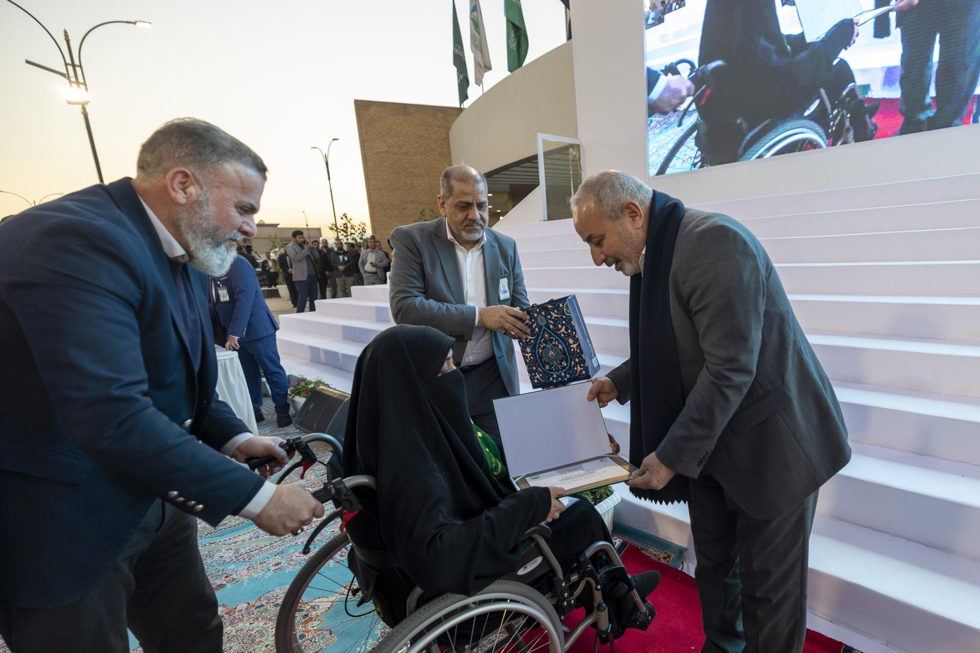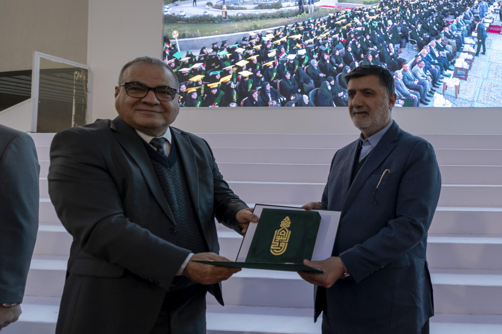 كرّمت العتبة العباسية المقدسة عددًا من ممثلي الجامعات المشارِكة في حفل التخرج المركزي لطالبات الجامعات العراقية العاشر. جاء ذلك في أثناء فعاليات ختام الحفل، الذي نظمته شعبة مدارس الكفيل الدينية النسوية التابعة لمكتب المتولي الشرعي للشؤون النسوية في العتبة المقدسة، تحت شعار (من نور فاطمة -عليها السلام- نضيء العالم)، بمشاركة أكثر من 5000 طالبة من 14 محافظة عراقية. وتناوب على التكريم كل من الأمين العام للعتبة المقدسة السيد مصطفى مرتضى آل ضياء الدين، ونائبه السيد عباس موسى أحمد، وأعضاء مجلس إدارتها: السيد ليث الموسوي، والسيد محمد الأشيقر، والدكتور أفضل الشامي، إلى جانب مدير مكتب المتولي الشرعي السيد جواد الحسناوي. وشمل التكريم أيضًا ممثل أولياء أمور الطالبات الخريجات السيد محمد صيوان، وطالبة من ذوي الهمم، وإحدى الطالبات المتفوّقات. وفي السياق ذاته قدم مدير هيأة البحث العلمي التابعة لوزارة التعليم العالي والبحث العلمي الدكتور شفيق شاكر، تذكارًا للعتبة العباسية المقدسة وتسلَّمه أمينها العام السيد آل ضياء الدين.