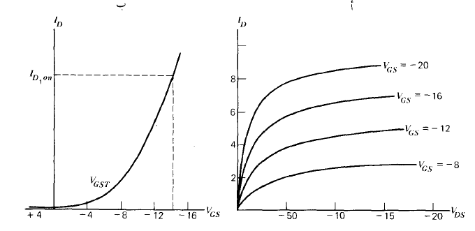 القناة الثقبية . بينما يوضح شكل (2 ب) منحني الإنتقال ، وهو عبارة عن العلاقة بين تيار المصب ID وجهد البوابة -منبع VGS. ويلاحظ أن التيار IDSS يكون صغيراً جد عندما تكون 0 << VGS (يصل إلى عدة فانوامبيرات) . وعند زيادة VGS. في الإتجاه السالب يزداد ID ببطء أولا. ومع إستمرار زيادة VGS يزداد تيار المصب زيادة سريعة. ويسمى جهد البوابة-منبع الذي يصبح عنده تيار المصب ذا قيمة معينة (جوالي 10 ميكروامبير) بجهد العتبة 1VGST او Threshold Voltage VT أما ID, on فيرمز للقيمة القصوى لتيار المصب والذي يتحقق عند قيمة معينة لجهد البوابة — منبع.