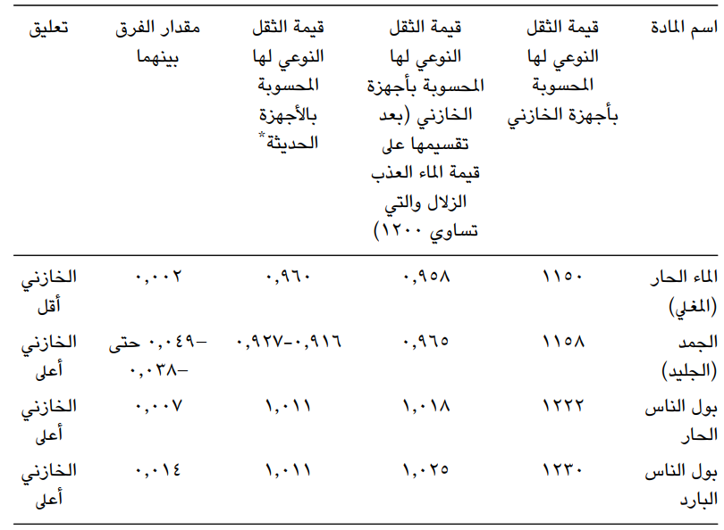 سعى الخازني في كتابه (ميزان الحكمة) للحصول على أعلى دِقَّة ممكنة في قياس أوزان الأشياء، وقد سعى أيضًا لقياس الثقل النوعي الذي يميز كل مادة عن أخرى. ويُمكن النظر إلى الجدول الآتي لمعرفة قيمة كثافة الماء الحار والجمد (الجليد) مقارنة بالقيم الحديثة: 93