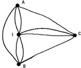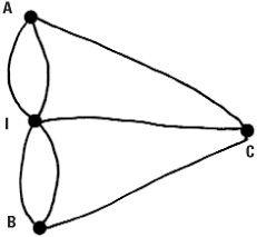 In 1735, Euler presented his solution to the Russian Academy, a solution which is now seen as the beginning of modern graph theory. In our semi-abstract diagram, the island in the middle of the river is labelled I and the banks of the river by A, B and C. Can you plan a walk for a Sunday afternoon that crosses each bridge just once? Pick up a pencil and try it. The key step is to peel away the semi-abstractness and progress to complete abstraction. In so doing a graph of points and lines is obtained. The land is represented by ‘points’ and the bridges joining them are represented by ‘lines’. We don’t care that the lines are not straight or that they differ in length. These things are unimportant. It is only the connections that matter.