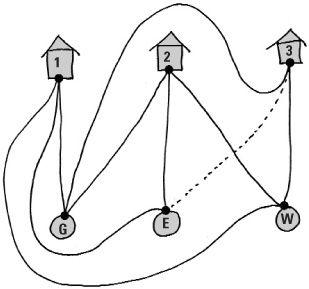 The utilities problem is an old puzzle. Imagine three houses and three utilities – gas, electricity and water. We have to connect each of the houses to each of the utilities, but there’s a catch – the connections must not cross.