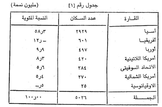 وقد بلغ عدد سكان العالم 5026 مليون نسمة تقريبا عام 1987 يتوزعون على النحو الذي توضحه أرقام الجدول رقم [1] :