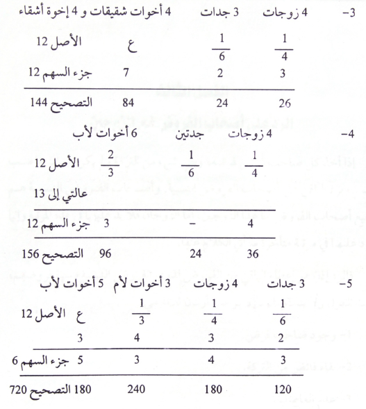 في هذه الحالة استخرجنا لكل طائفة جزء سهم على حده بالطريقة المتقدمة ثم أتينا بالمضاعف المشترك بين أجزاء السهام المختلفة فيكون جزء سهم مشتركاً به وتصح المسألة كلها يضربه في أصل المسألة أو عولها وفي السهام المأخوذة.