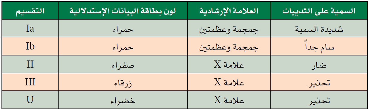 جدول يوضح تقسيم المبيدات حسب درجة سميتها على الثدييات طبقاً لجداول منظمة الصحة العالمية.