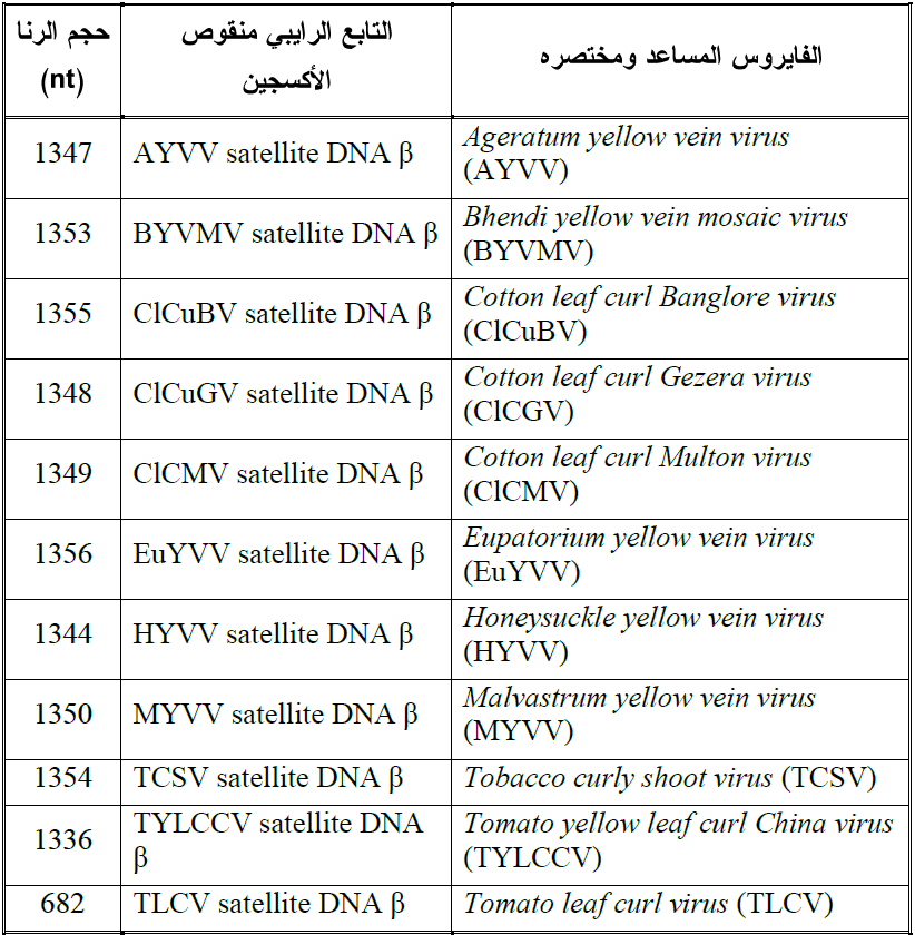 جدول يبين التوابع الرايبية منقوصة الاكسجين مفردة الخيط ssDNA satellitrs