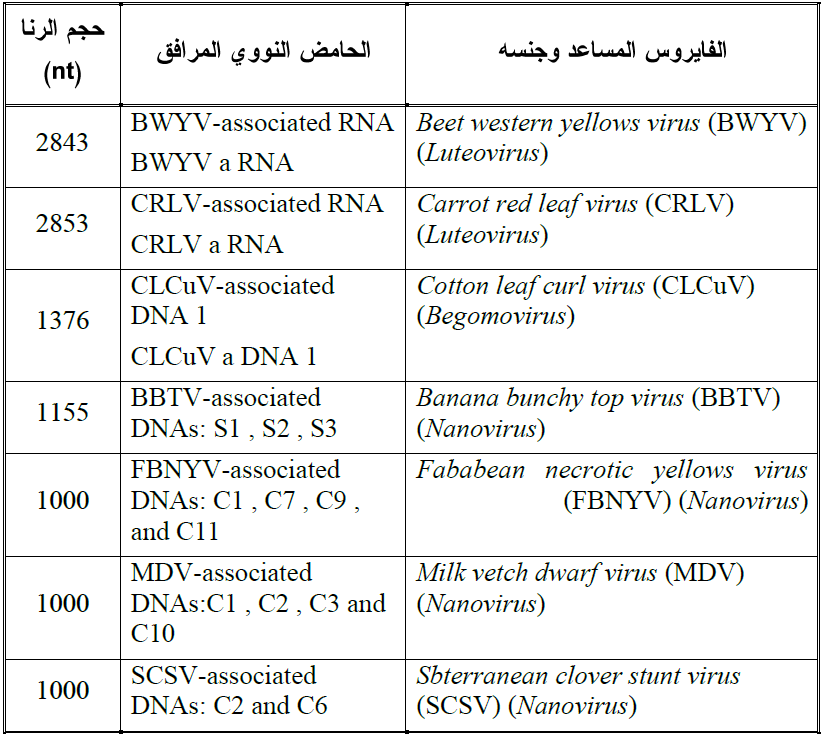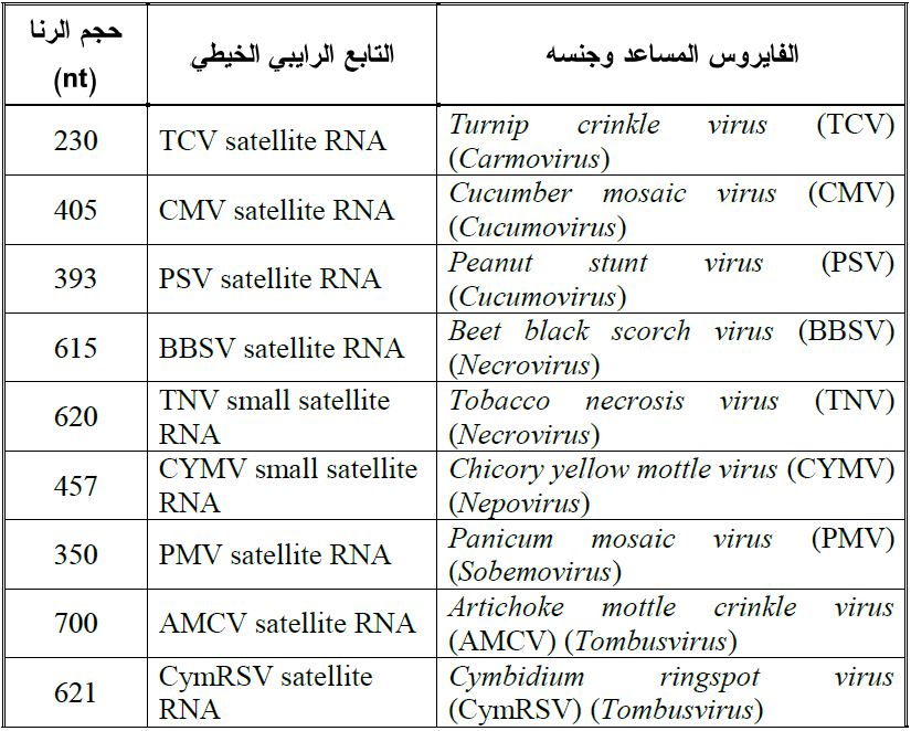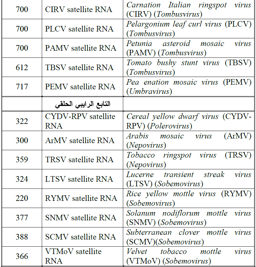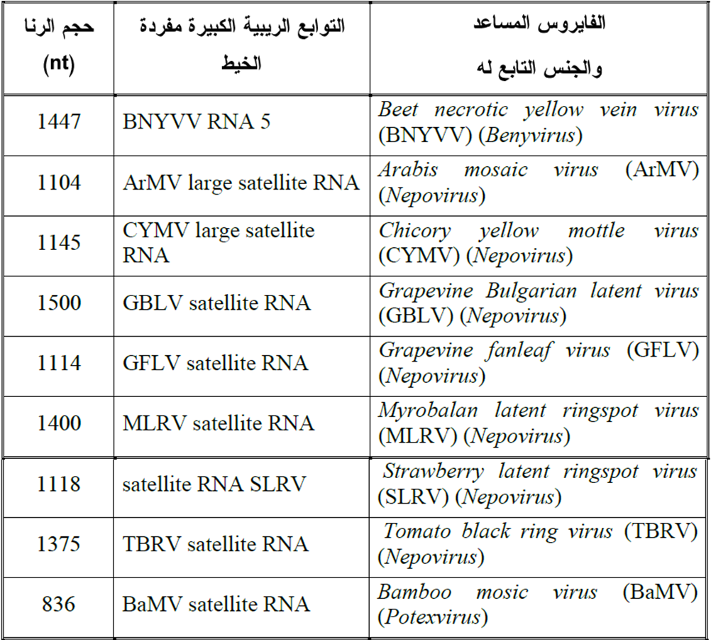 جدول يوضح التوابع الرايبية الكبيرة مفردة الخيط Large ssRNAs Satellites