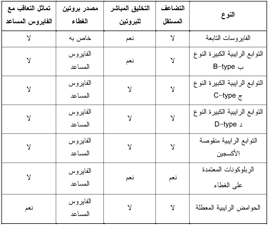 يقارن الجدول التالي بين الفايروسات التابعة والتوابع الرايبية التي ذكرت آنفا.